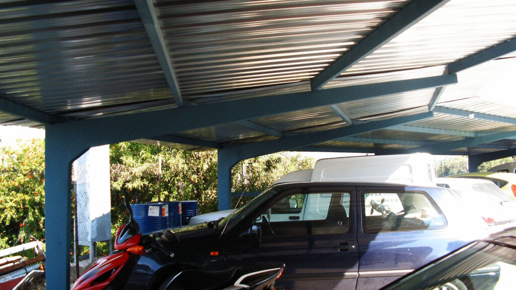 Mediante una resistente estructura metálica compuesta por ménsulas, correas de cubierta y chapa metálica de cerramiento creamos plazas cubiertas de aparcamiento con la posibilidad de varios modelos y colores.